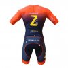 Der Renneinteiler ist ein Einteiler, der den Trend zu mehr Aerodynamik fortsetzt, das Konzept besteht aus einer Mischung eines klassischen Zeitfahranzugs und eines 2-teiligen Aero-Sets. Der Einteiler hat einen durchgehenden verdeckten Reißverschluss und ist an der Vorderseite nicht mit dem Unterteil vernäht, lässt sich also komplett öffnen. Die Vorderseite des Oberteils und der Hose überlappen sich über einen breiten Bereich. Die Gripp-Elemente an der Unterseite des Oberteils verhindern in Kombination mit den Silikonelementen an der Außenseite des Unterteils ein Hochrutschen des Anzugs auch bei ausgiebigen Jubelfeiern beim überqueren der Ziellinie.An der Rückseite sind Ober- und Unterteil zusammengenäht. In den zwei Rückentaschen findet die Rennverpflegung oder eine Windweste Platz. Die Vorder- und Rückseite wird für optimale Aerodynamik aus einem glatten Stoff gefertigt. An den Seiten und unter den Armen verwenden wir einen Mikrofaser-Netzstoff, um maximale Atmungsaktivität zu garantieren.An den Armen kommt der 45mm T-EVO Abschluss zum Einsatz, dieser kommt ohne eine Silikonbeschichtung aus. Der Abschluss ist so konstruiert, dass auf der Innenseite die Elasthanfäden für einen Gripp-Effekt sorgen. Dadurch kommt es weder zu Hautirritationen, noch zum frühzeitigen Verschleiß, wie es bei aufgebrachten Silikonbeschichtungen passieren kann.Die Hose wird aus einem Stoff mit hoher Rücksprungsstärke und Kompressionseffekt gefertigt. An den Beinen den kommen bedruckte T-EVO Abschlüsse zum Einsatz.